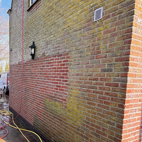 Voor het reinigen van het metselwerk is gewerkt met warm water onder gepaste druk, zodat vervuiling, aanslag en atmosferische vervuiling effectief worden verwijderd zonder het metselwerk te beschadigen. Door deze aanpak komt de oorspronkelijke kleur van de gevel weer mooi naar voren en wordt de levensduur van het metselwerk verlengd.