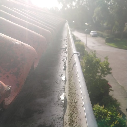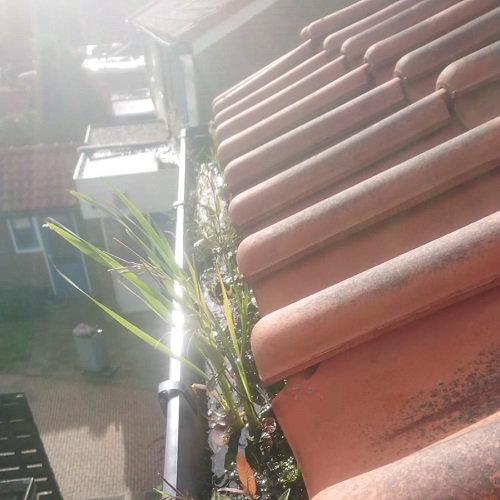 Het leeghalen van de dakgoten voorkomt verstoppingen en wateroverlast, wat de levensduur van het dak en de gevel ten goede komt. Voor deze werkzaamheden waren geen aanvullende veiligheidsmaatregelen zoals harnas of hoogwerker nodig, omdat de situatie veilig bereikbaar was.